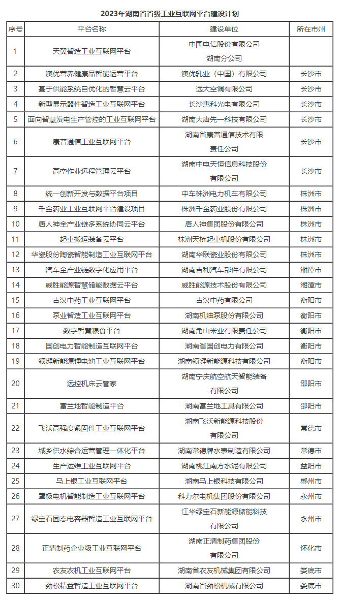 為深入開展“智賦萬企”行動,持續(xù)建設省級工業(yè)互聯(lián)網(wǎng)平臺體系,加快企業(yè)數(shù)字化轉型,打造國家重要先進制造業(yè)高地,經(jīng)企業(yè)申報、市州推薦、現(xiàn)場答辯、專家評審等程序,省工信廳同意天翼智造工業(yè)互聯(lián)網(wǎng)平臺等30個項目列入2023年湖南省省級工業(yè)互聯(lián)網(wǎng)平臺建設計劃,現(xiàn)予發(fā)布。